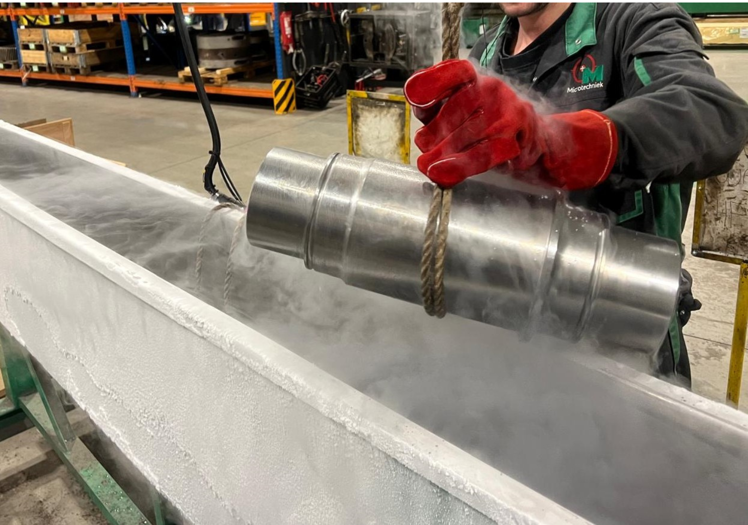 De as hebben we in een bad gekoeld met vloeibare stikstof tot -196°C. Nadat de assen zijn geplaatst worden er per loopwiel twee lagers en afdekplaten ter bescherming aangebracht. Uiteraard wordt het lager behandeld om corrosie tegen te gaan voordat de bescherming wordt aangebracht.